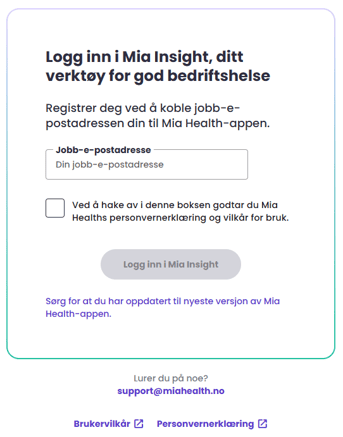 På pc, Mac eller pad går du inn via nettleseren din og åpner nettsiden: insight.miahealth.no. Der skriver du inn e-postadressen du er registrert med (Merk: dette kan være en annen adresse enn den du har som privat bruker i Mia Health-appen), haker av for å godkjenne personvern og vilkår og trykker knappen "Logg inn i Mia Insight".