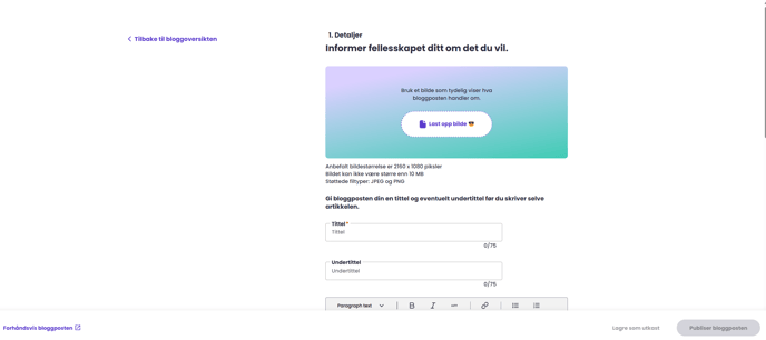 Her kan du legge til valgfritt "Toppbilde" og starte med å fylle ut "Tittel" og "Undertittel":