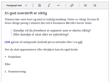 I selve hovedfeltet legger du inn selve teksten. Her finnes flere redigeringsverktøy.