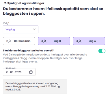 Du kan velge å sende til hele organisasjonen, eller til medlemmer i ulike lag eller egenskapene i egenskapsgruppene. Du kan også velge om bloggposten skal festes øverst og eventuelt hvor lenge.
