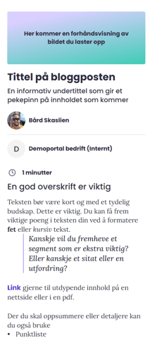 Er du ferdig og klar til å publisere, trykker du på knappen "Publiser bloggposten" i nedre høyre hjørne. Bloggposten vil da umiddelbart deles med den definerte målgruppen i Mia Health-appen.