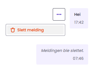 Vil du slette en sendt gjør du dette ved å trykke på den gjeldende meldingen, trykke på de "tre prikkene" og velge "Slett melding". Du vil etter sletting se status "Meldingen ble slettet".