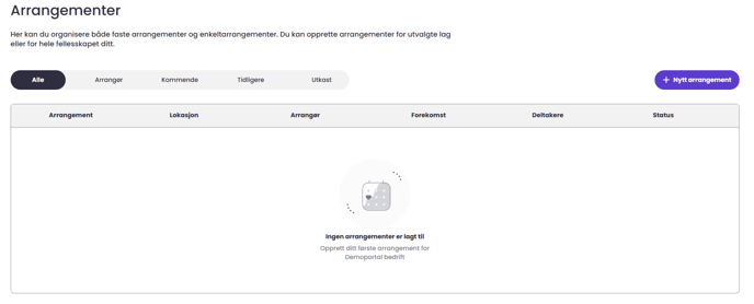 På startsiden for arrangementer trykker du nå på knappen "+ Nytt arrangement" på høyre side for å komme i gang med ditt første arrangement.