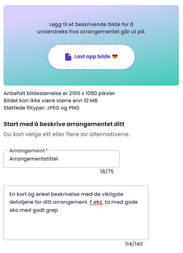 Dette åpner selve redigeringsvinduet, der du starter med å legge til et valgfritt arrangementsbilde, en arrangementstittel og en kort beskrivelse.