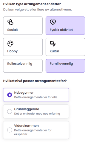 Deretter definerer du type arrangement og nivå. Under type arrangement kan du velge mellom ulike bokser og du kan velge flere, avhengig av målgruppe og type. Det er tre nivåinndelinger som sier noe om hvem som bør og kan delta.