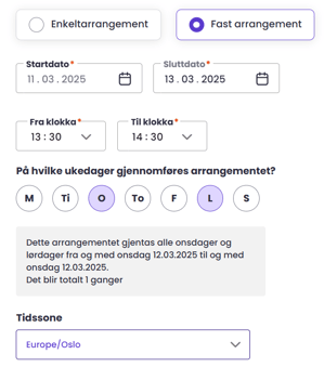 For enkeltstående arrangementer velger du startdato og sluttdato (kan være samme dag eller gå over flere dager) og fra/til klokkeslett, før du velger tidssonen du er i.