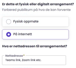 Ved et digitalt arrangement limer du inn linken til arrangementet - det være seg Teams, Zoom, Youtube osv.