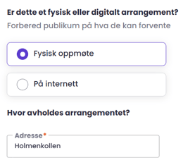 Du velger deretter om dette er et fysisk eller digitalt arrangement.