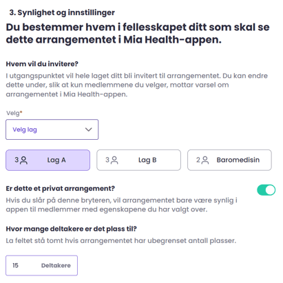 Du kan velge å invitere hele organisasjonen, medlemmer i ulike lag eller til egenskapene i egenskapsgruppene. Du kan også velge om det er et privat eller åpent arrangement, og antall maksimalt deltagere.