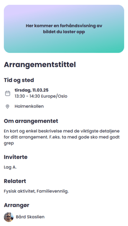Er du ferdig og klar til å publisere, trykker du på knappen "Publiser arrangement" i nedre høyre hjørne. Arrangementet vil da umiddelbart deles med den definerte målgruppen i Mia Health-appen.